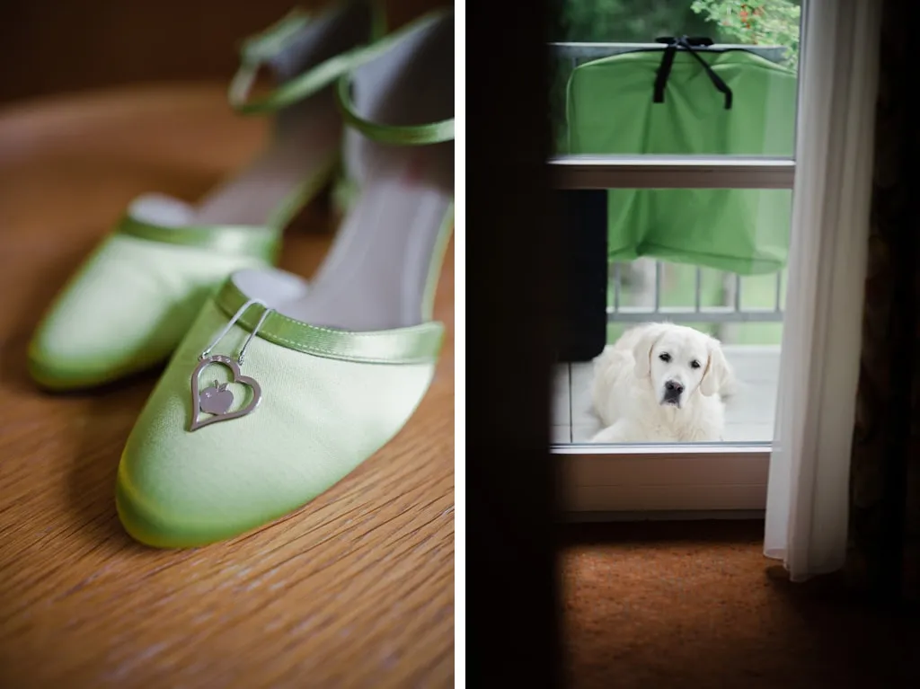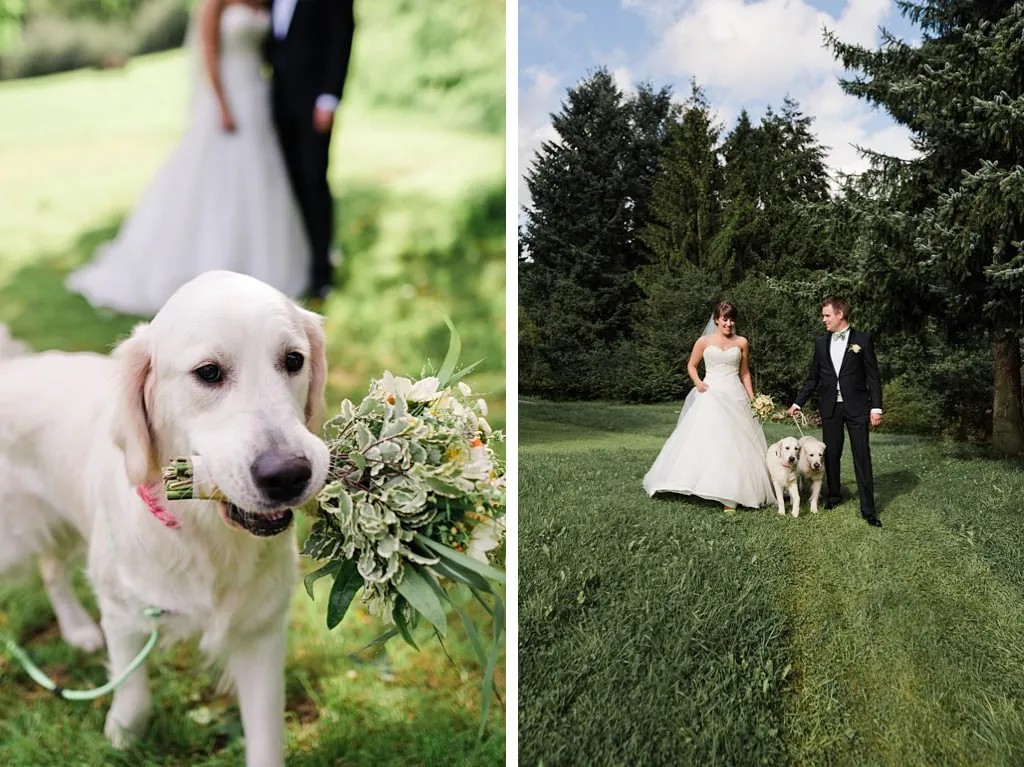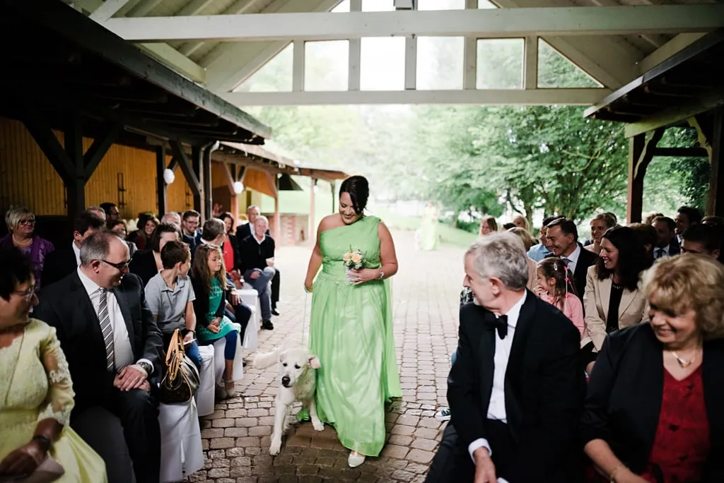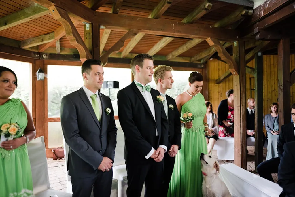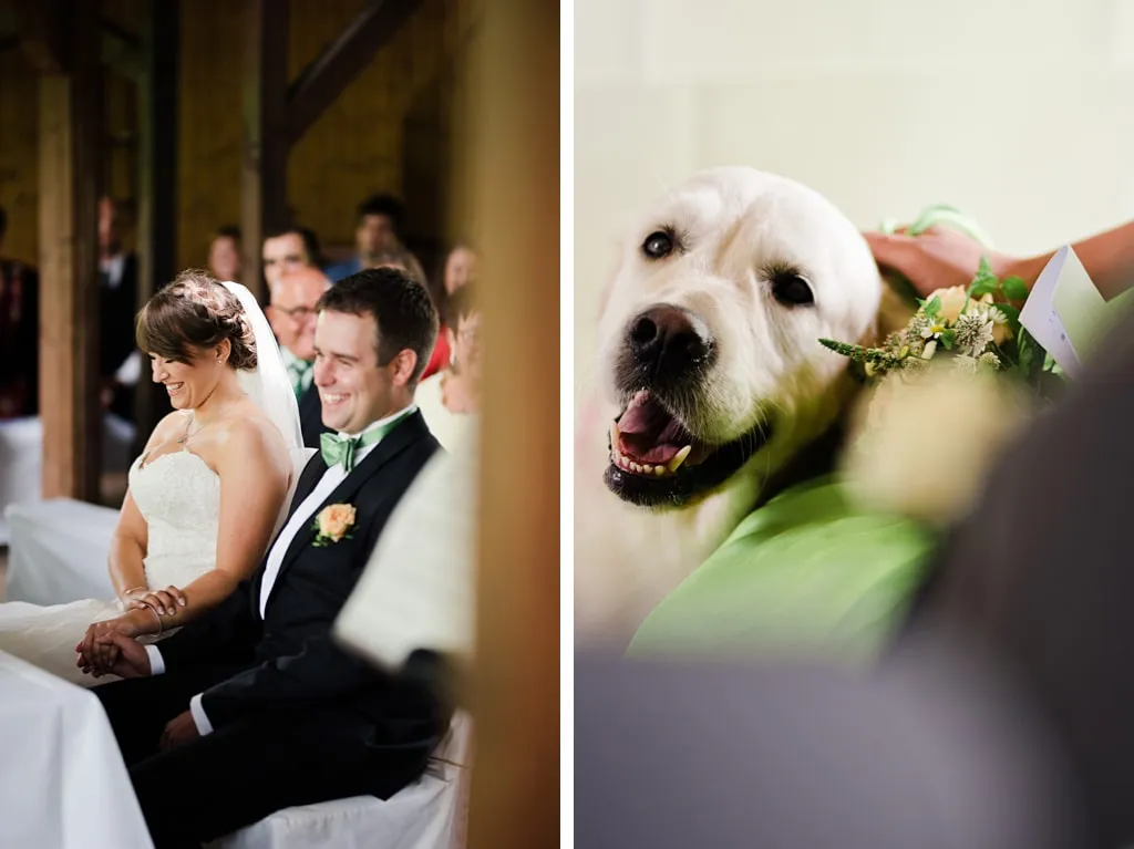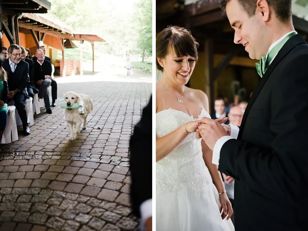 Unser Traum war es draußen zu heiraten und unsere beiden Hunde dabei zu haben, auch wenn die Trauung letztendlich wegen des regnerischen Wetters die Tage zuvor neben statt unter dem Apfelbaum gehalten wurde. 😉