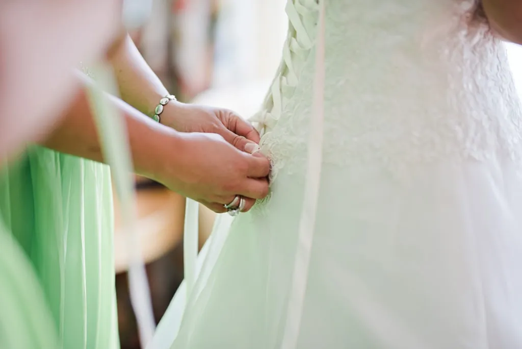 Es war ein absoluter Spontankauf. Eigentlich wollten wir – ich, meine Mutter und meine beiden Trauzeuginnen – uns auf der Hochzeitsmesse in Dortmund nur ein paar Ideen holen. Doch dann hing dieses Kleid dort! Es war genauso, wie ich es mir vorgestellt hatte und dann auch noch genau in meiner Größe. Es ist eine klassische A-Linie in Ivory, mit geschnürrter Korsage am Rücken, Herzausschnitt, einer dezenten aufgenähten Spitze bis zur Hüfte und einem ganz schlichten ausgestellten Rock. Dazu ein ganz schlichter Schleier. Ich bin etwas kurviger und das Kleid unterstrich perfekt meine Vorzüge und kaschierte meine Problemzonen – genauso wie sein sollte! Später entschied ich mich noch für ein paar Brautschuhe von Rainbow, die ich apfelgrün – farblich passend zu unserem Motto – einfärben ließ. Die grünen Schuhe zu dem weißen Kleid waren ein absoluter Blickfang!