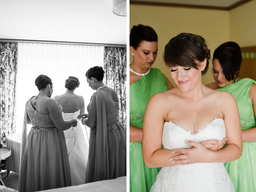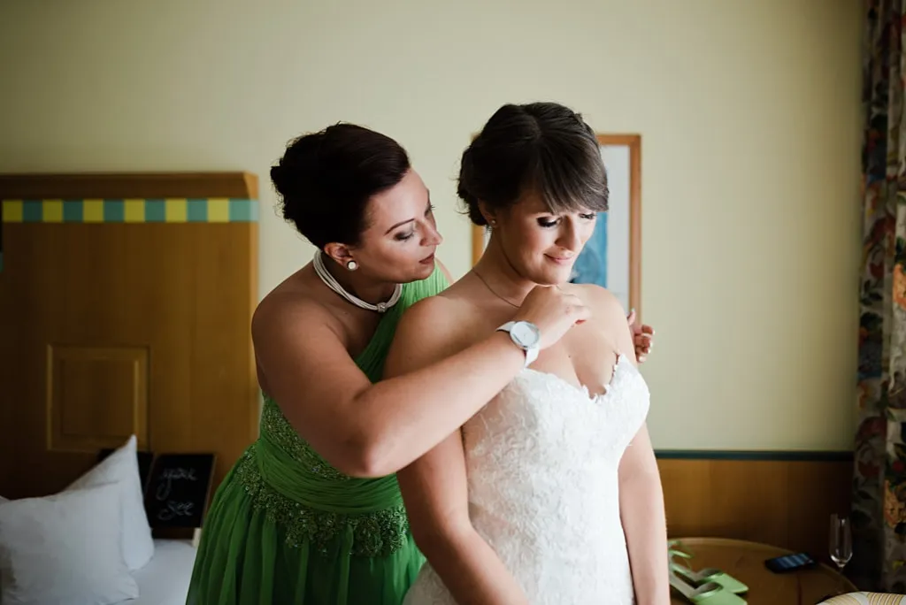 Während ich mich mit meinen Mädels und meiner Stylistin in unserem Hotelzimmer auf die Trauung vorbereitete, ließ mir mein zukünftiger Ehemann ein Geschenk zukommen mit einer Karte, auf der Bilder aus den vergangen Jahren von uns beiden drauf waren. In der Schmuckschachtel war ein zierliches Armband mit einem Herz. Die Worte auf der Karte haben mich sehr berührt. Er war in diesem Moment nicht bei mir und doch ganz nah!