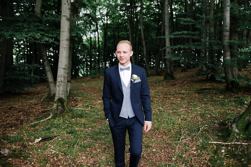 Maik hatte also schon eine genaue Vorstellung von dem, was er möchte, hat das aber nicht mit mir geteilt, denn auch ich wollte und sollte überrascht werden (gleiches Recht für alle). Also ist er im Frühjahr mit seinem Papa und drei Freunden losgefahren, hatte diesen Anzug an und wusste, der wird es. Zur Sicherheit hat er noch einen schwarzen Anzug angezogen. Aber der erste dunkelblaue Anzug, mit hellblauer Weste, Fliege und Einstecktuch, hatte es ihm angetan. Und mir bei unserem First Look auch.